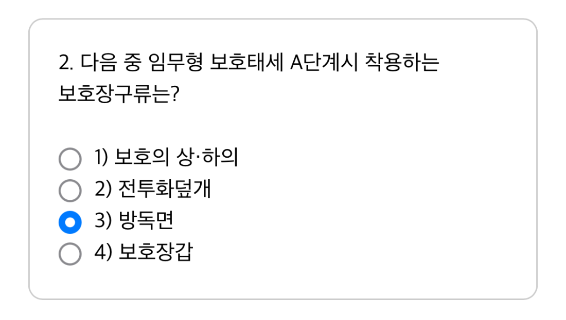 이유: MOPP 3단계에서는 보호의 상·하의, 전투화덮개, 방독면을 착용하며, 보호장갑은 MOPP 4에서 추가됩니다.