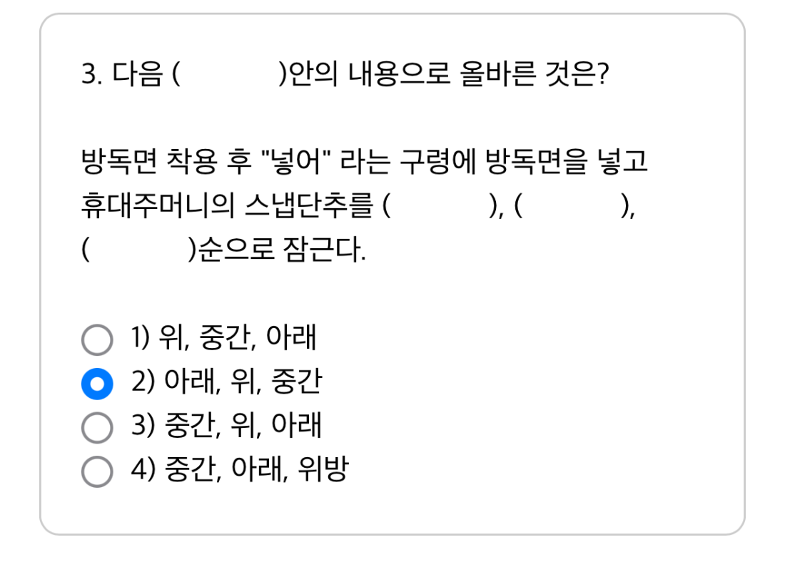 3. 방독면 착용 후 "넣어"라는 구령에 방독면을 넣고 휴대주머니의 스냅단추를 (⠀⠀⠀), (⠀⠀⠀), (⠀⠀⠀)순으로 잠근다.