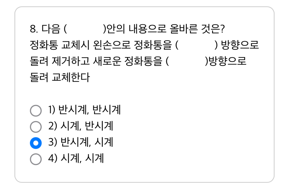 8. 정화통 교체 시 왼손으로 정화통을 (⠀⠀⠀) 방향으로 돌려 제거하고 새로운 정화통을 (⠀⠀⠀)방향으로 돌려 교체한다.