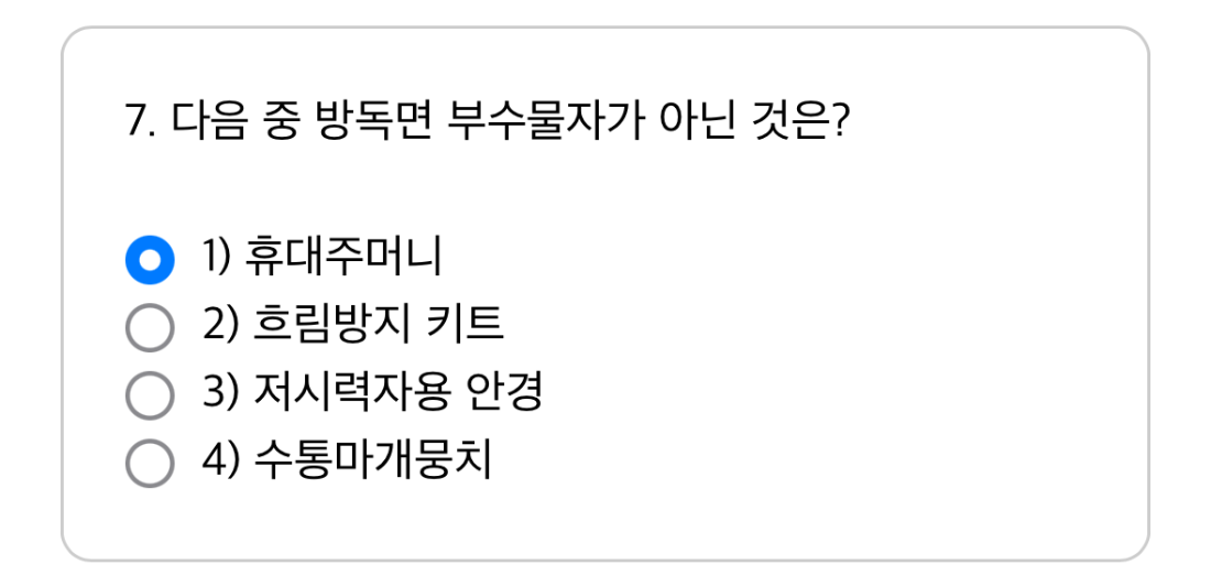 이유: 부수물자 정의: 흐림방지 키트, 수통마개뭉치, 저시력자용 안경은 방독면 사용에 필요한 부수물자지만, 휴대주머니는 기본 구성품으로 간주됩니다.